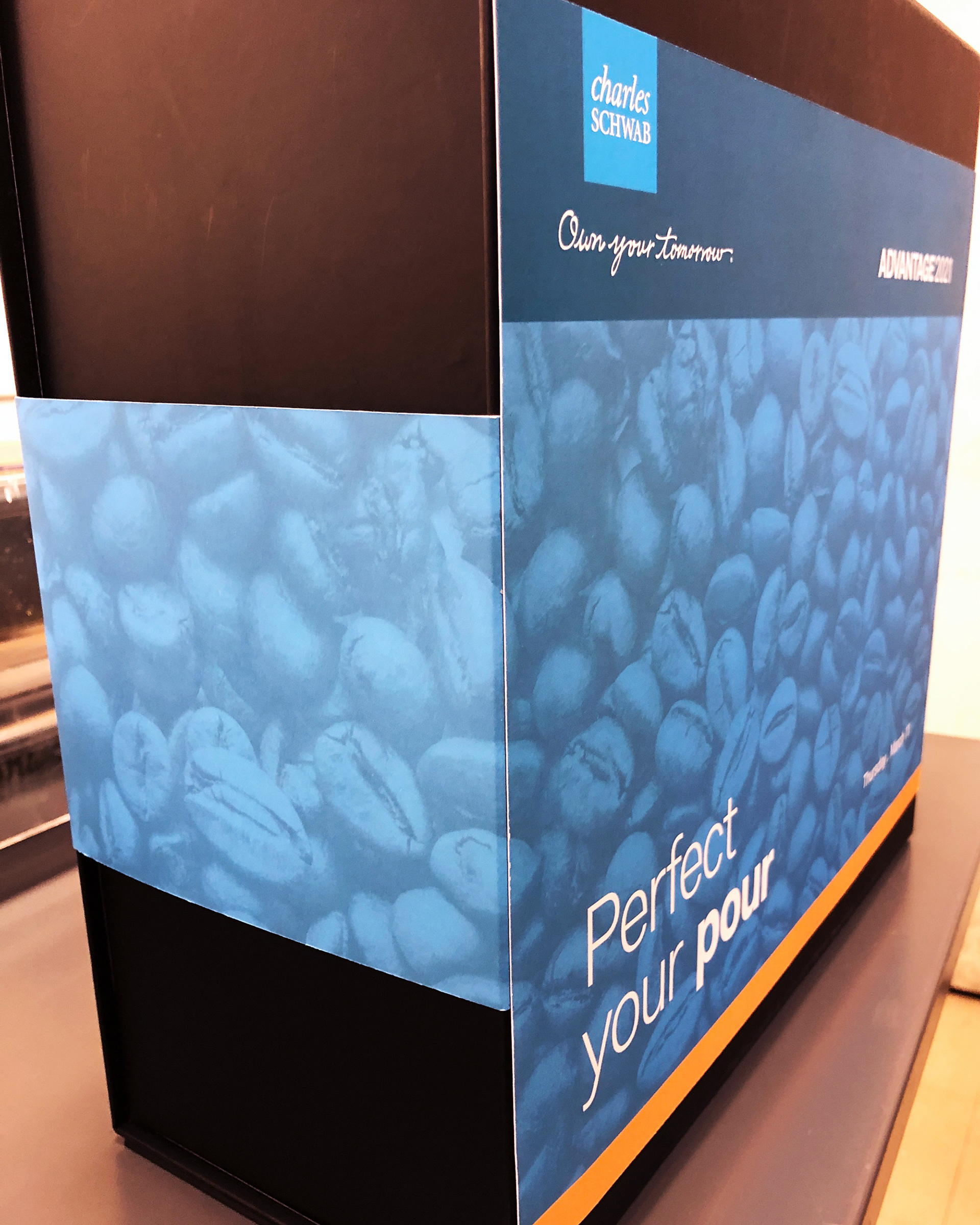 Division of a single band design (provided by Charles Schwab and Radeff Designs) into three sections assembly. New measurements and bleeds set up to accommodate for paper weight. Color corrections made to match printer output to Schwab branding.